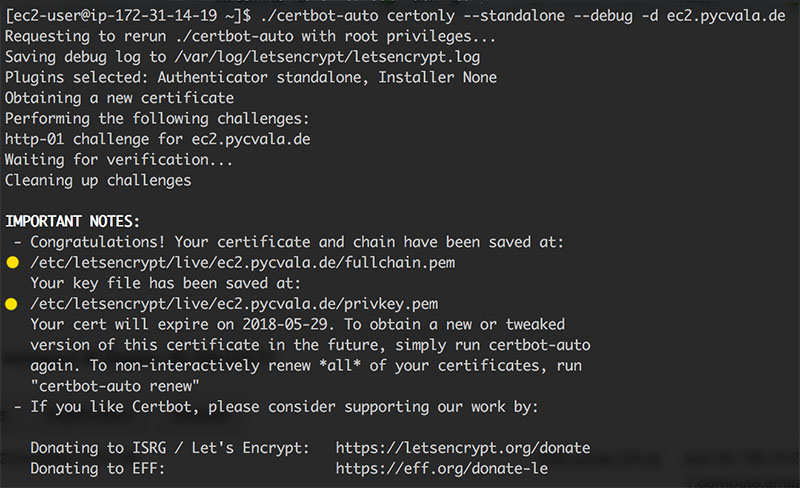 Since, at the time of writing, Amazon Linux wasn’t officially supported, we will need to run Cerbot’s tool in standalone mode with the debug flag on and update the Apache config ourselves.