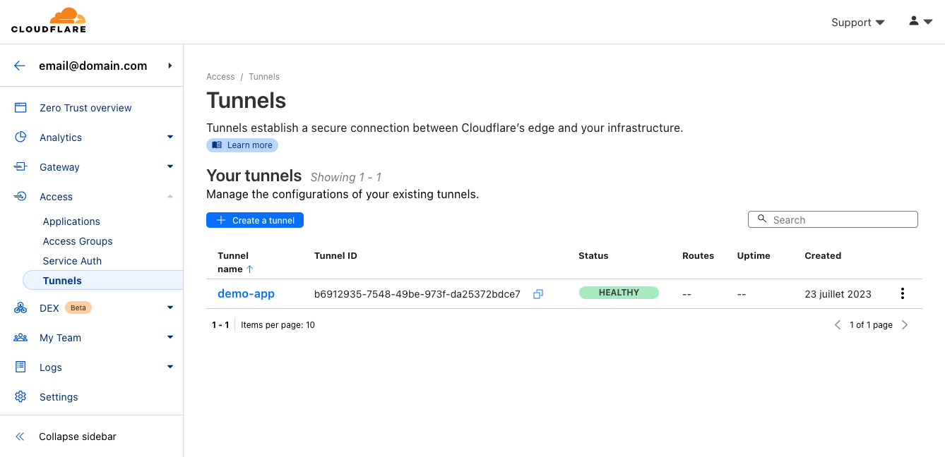 Step 1: Open a web browser and enter your Cloudflare Tunnel’s assigned domain name. You can find this in the Cloudflare Dashboard under “Tunnels” in the “Network” tab. Uou should see a Healty tunnel if everything is set up correctly.
