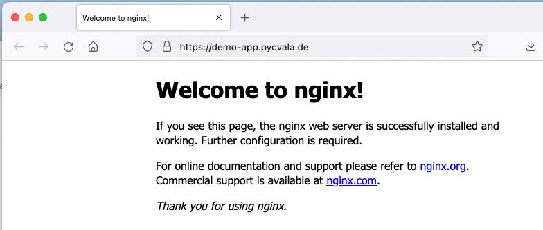 Step 3: Here is where you configure your public domain for the app we created. Here I’m using demo-app.pycvala.de as the domain. It will take care of SSL and HTTPS for us. Since we’re using Docker Compose, we can reference our app using Docker’s private DNS via the service name, here nginx followed by the port 80 exposed by the container.